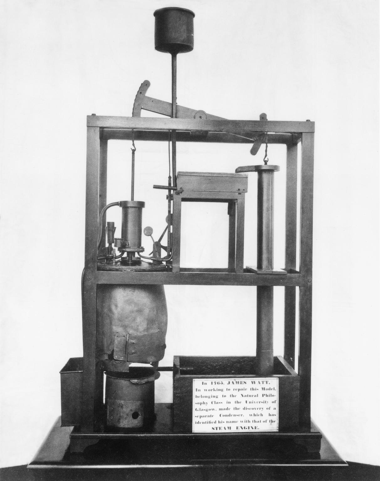 Beruflich bedingt konnte ich mich erst im Winter 1763-4 wieder mit dem Thema befassen, als ich die Gelegenheit erhielt, das Modell einer Newcomen Maschine zu reparieren, welches der “Natural Philosophy class” der Universität von Glasgow gehörte. In dieser Zeit stammten meine Kenntnisse hauptsächlich von Desaguliers und zum Teil von Belidor. Ich reparierte das Modell mechanisch. Damit fertig, musste ich erstaunt feststellen, dass der Kessel, obwohl scheinbar durchaus groß genug, das Modell nicht mit genügend Dampf versorgen konnte. Die Maschine machte einige Hübe, benötigte dabei eine enorme Menge an Einspritzwasser, obwohl die Last durch die Wassersäule der Pumpe nur gering war …